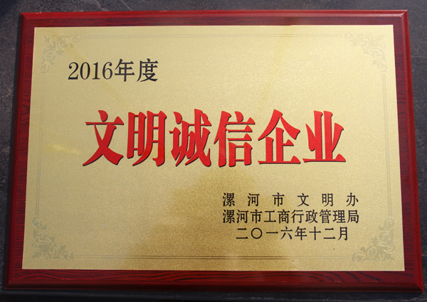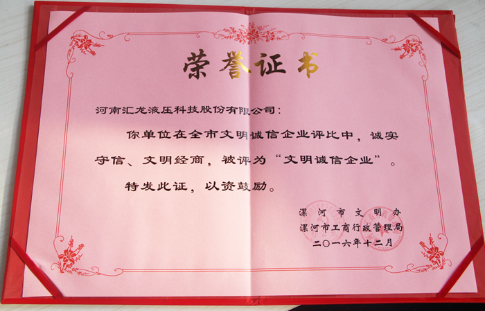 為培育和踐行社會(huì)主義核心價(jià)值觀,不斷提高公民道德素質(zhì)和社會(huì)文明程度,積極營(yíng)造文明、誠(chéng)信的社會(huì)環(huán)境,漯河市文明辦、漯河市工商局在全市開(kāi)展“文明誠(chéng)信企業(yè)、文明誠(chéng)信商戶(hù)”的評(píng)選活動(dòng),通過(guò)有關(guān)部門(mén)層層嚴(yán)格把關(guān)、逐級(jí)推薦,河南匯龍液壓科技股份有限公司獲得了“2016年度文明誠(chéng)信企業(yè)”的榮譽(yù)稱(chēng)號(hào)。